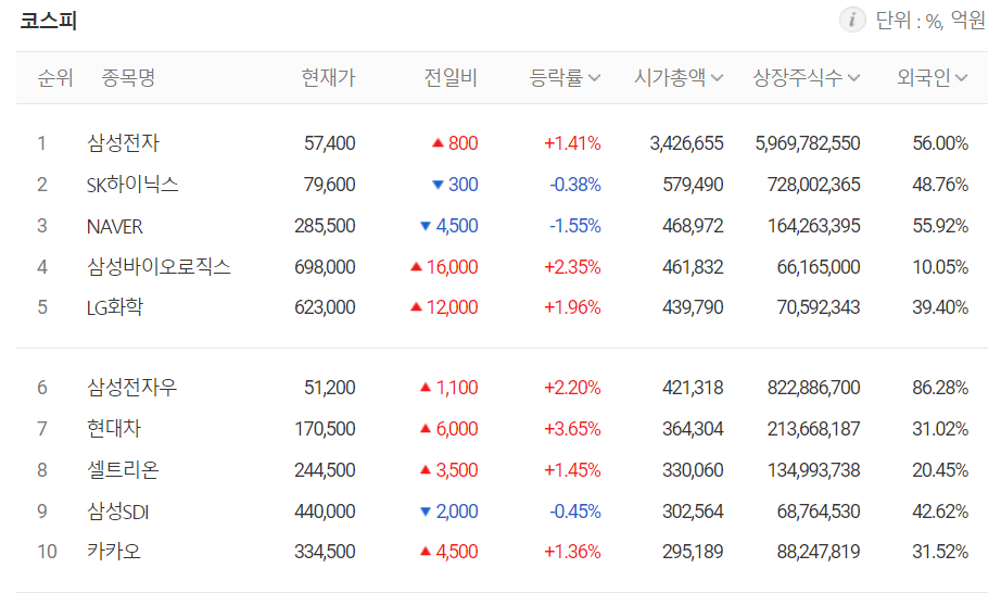 시가총액 상위 10개 종목 중 CJ ENM을 제외한 전종목이 상승 마감했습니다.