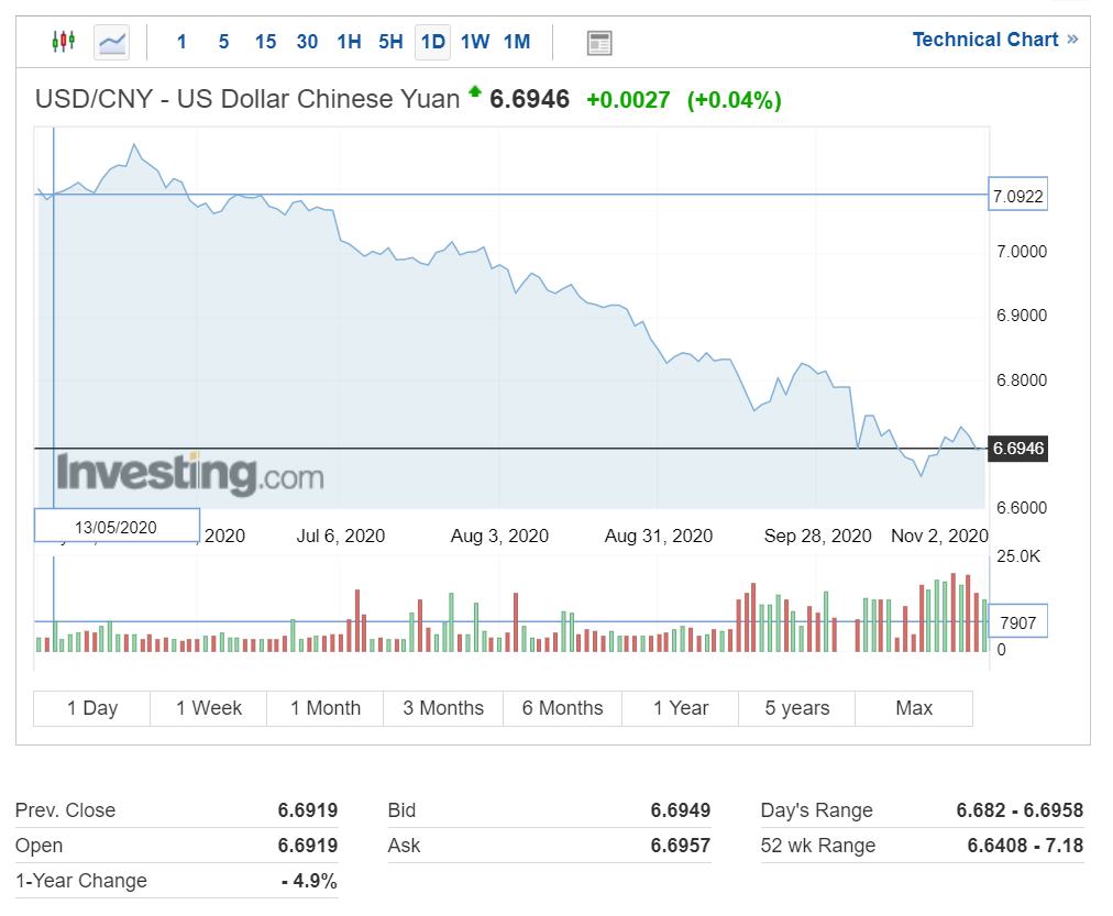 중국 위안화는 1달러당 6.6946 위안을 기록하면서 소폭 상승 중입니다.