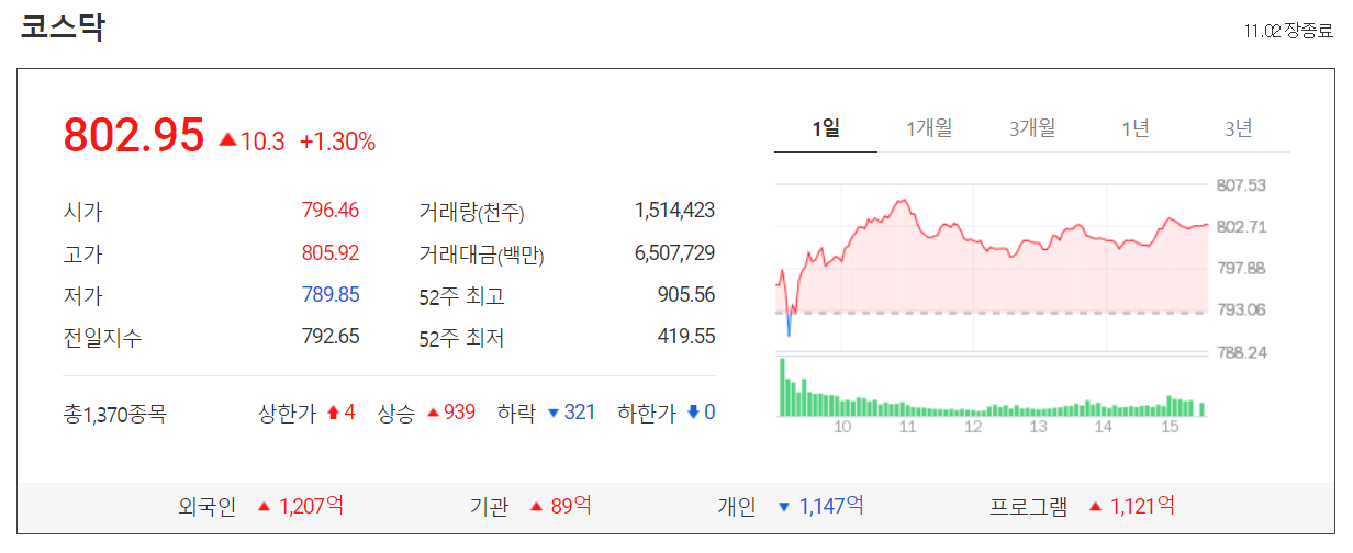 오늘 코스닥은 전 일 대비 10.3포인트(1.30%) 오르며 802.95로 장을 종료했습니다.