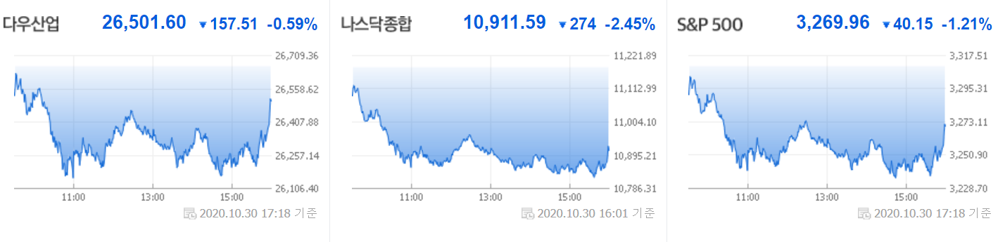 지난 주 금요일 뉴욕증시는 거래일 기준 3일 앞으로 다가온 미국 대선의 불확실성, 코로나19 재확산으로 인한 경기 둔화 우려 등으로 하락한 가운데 특히 주요 기술주인 애플(-5.6%), 트위터(-21.11%), 페이스북(-6.31%), 아마존(-5.45%) 등 큰 폭으로 하락하면서 나스닥 지수 2.45% 끌어내렸습니다.