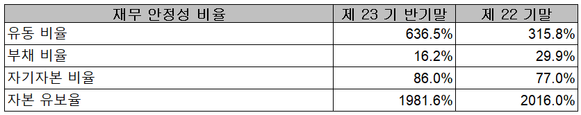 지난 상반기 재무안정성 비율에서는 유동비율 636.5%, 부채비율 16.2%, 자기자본비율 86%, 자본유보율 1,981.6%를 기록하면서 건실하고 안정적인 재무상태를 유지하고 있습니다.