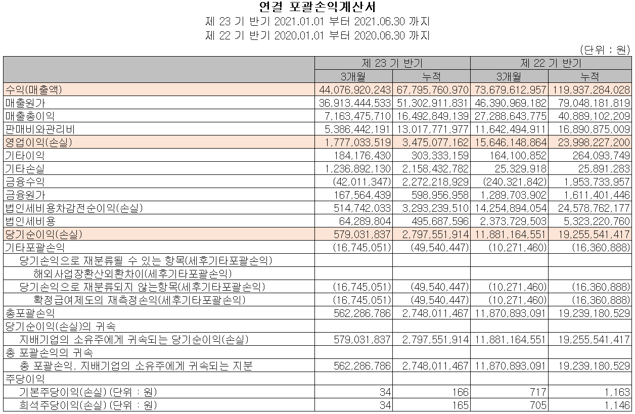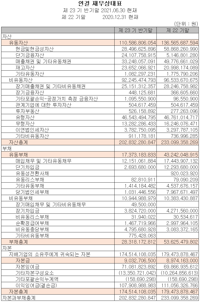 지난 상반기 현재 자산총계는 전기 대비 303억 원이 줄어든 2,028억 원으로 현금성 자산, 매출채권 등 유동자산과 무형자산 등 비유동자산의 감소에 기인합니다. 부채총계는 253억 원이 감소한 283억 원으로 장단기 차입금 및 매입채무의 감소가 있었습니다. 자본에서는 주식매수선택권 행사와 전환사채의 상환에 따라 자본금과 잉여금 등이 증가하였으나, 자기 주식 거래로 인한 감소와 이익잉여금이 감소하면서 자본총계는 50억 원 줄어든 1,745억 원을 기록했습니다.