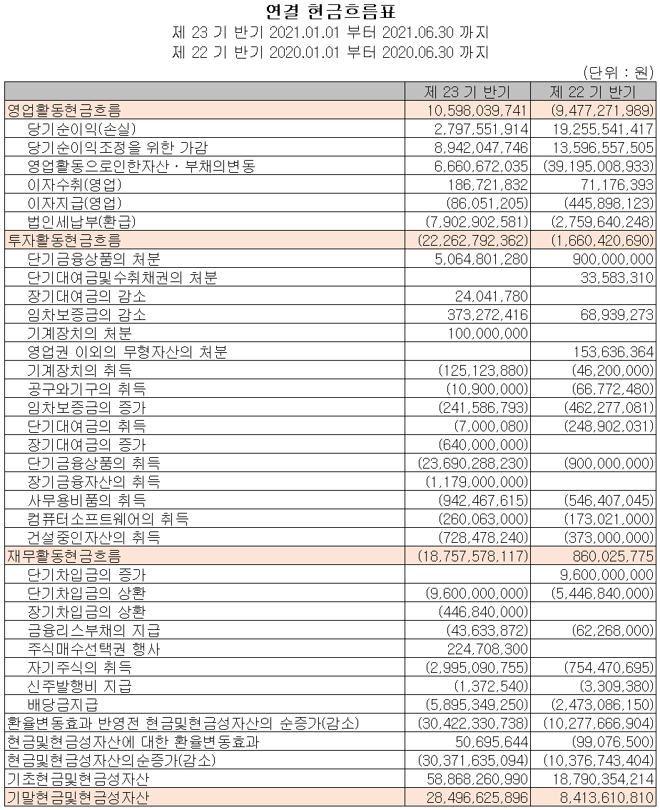 지난 상반기 영업활동 현금흐름에서는 106억 원의 현금이 유입되었으며, 투자활동에서는 금융상품 및 유무형 자산의 취득으로 223억 원의 현금이 유출되었습니다. 재무활동에서는 당기 부채를 상환하고 자기주식을 취득하였으며, 배당금을 지급하면서 총 188억 원의 현금이 유출되었습니다. 2021년 상반기 말 기준 현금성 자산은 전기 말보다 201억 원이 늘어난 285억 원을 보유하고 있습니다.
