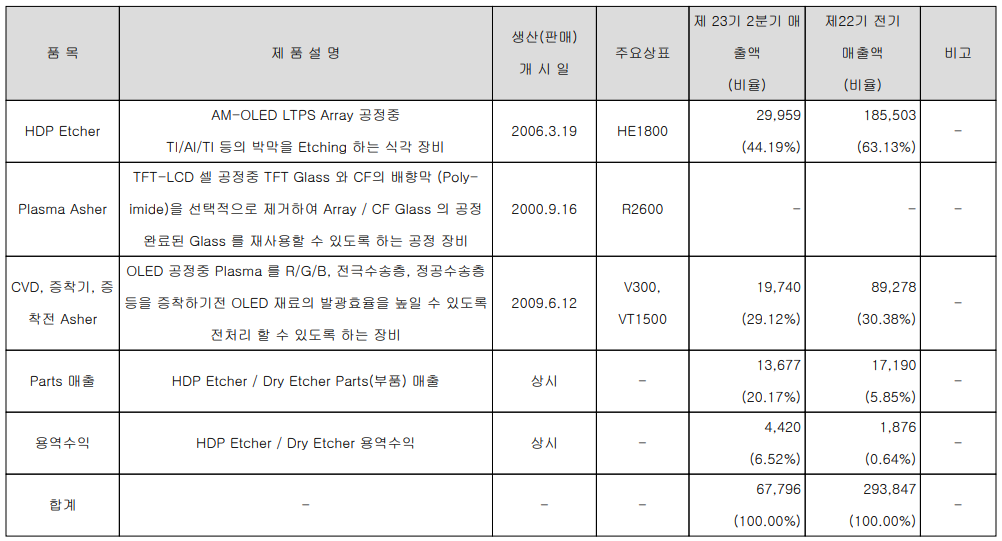 당사는 평판형 디스플레이인 TFT, OTFT, AMOLED 등 디스플레이 전공정에 필요한 식각, Asher, 증착 등의 장비를 제조, 공급하는 사업을 영위하고 있습니다. 지난 상반기 식각 장비(Etcher)의 매출은 300억 원으로 전체 매출의 44.19%를 차지하였으며, OLED Asher는 197억 원으로 29.12%, 기타 계열회사인 아이씨디 머트리얼즈가 생산하는 디스플레이 정전척 등 부속품 매출은 137억 원으로 20.17%의 매출 비중을 나타냈습니다.