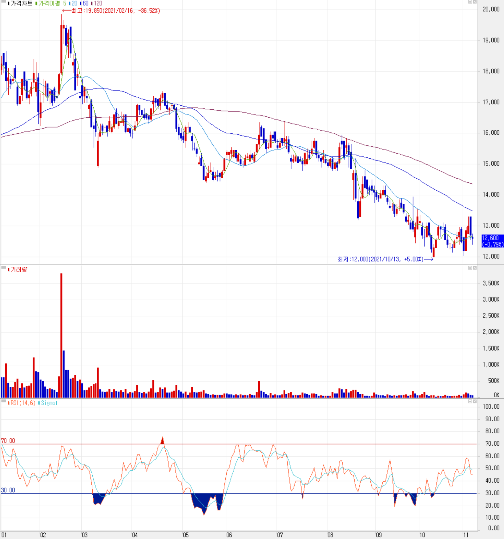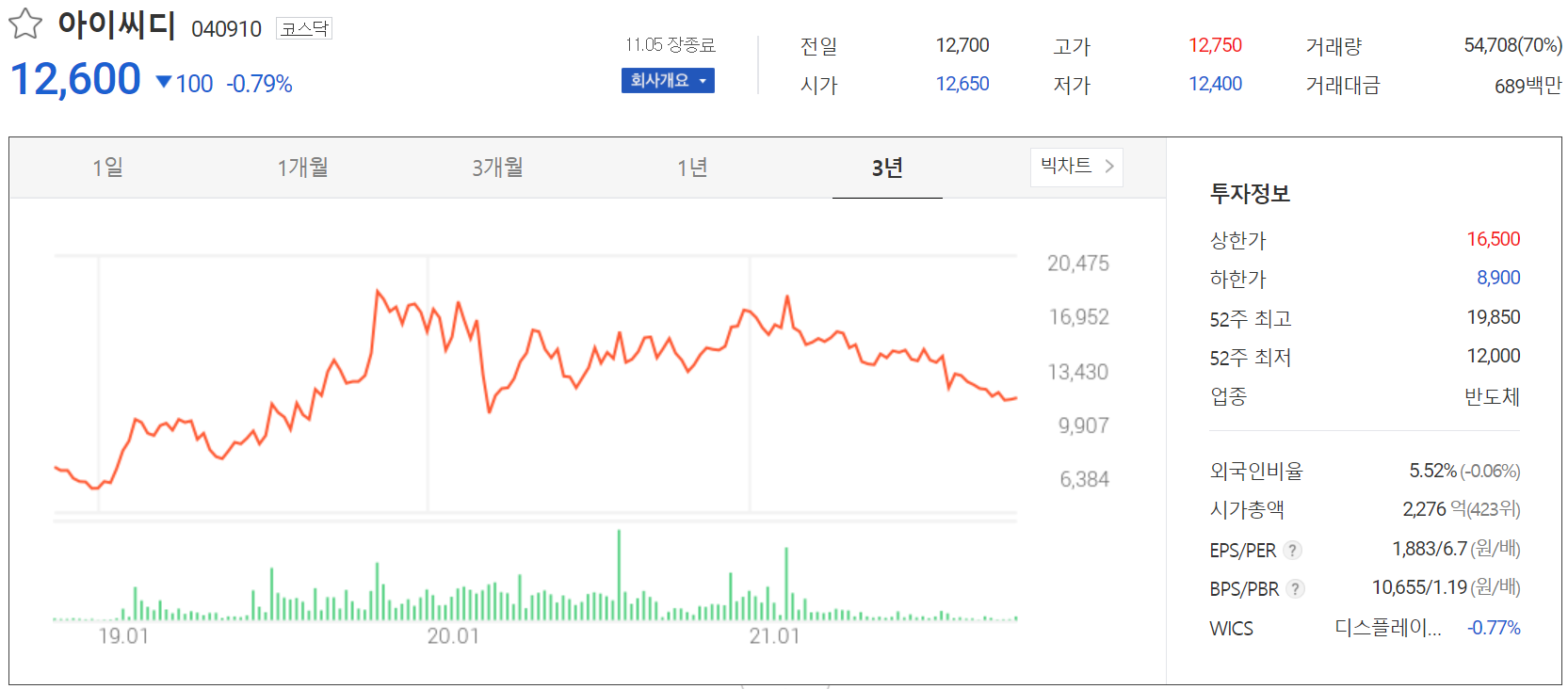 11월 5일 장 종료 기준 당사의 주가는 전일보다 0.79% 내린 12,600원에 거래를 마쳤습니다. 외국인 비중은 5.52%이며, 시가 총액 2,276억 원으로 코스닥 시총 기준 423위 종목입니다.