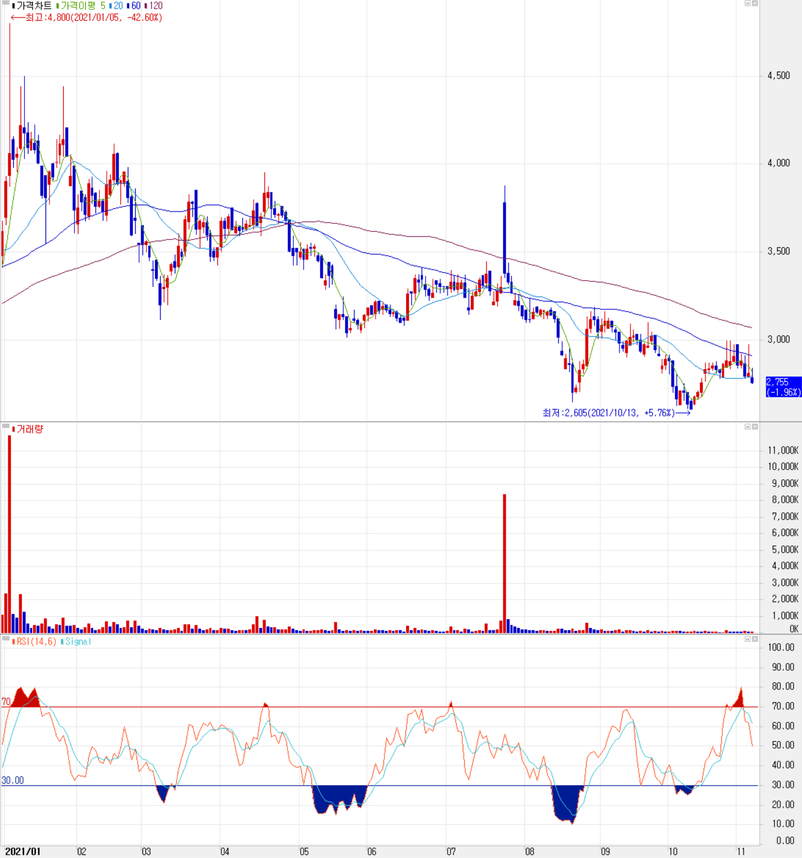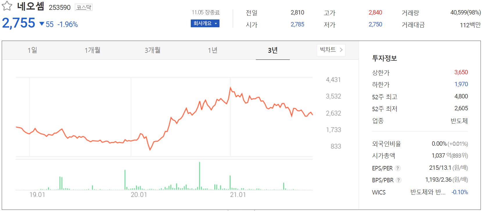 11월 5일 장 종료 기준 당사의 주가는 전일보다 1.96% 내린 2,755원에 거래를 마감했습니다. 시가 총액은 1,037억 원으로 코스닥 시총 기준 893위 종목입니다.