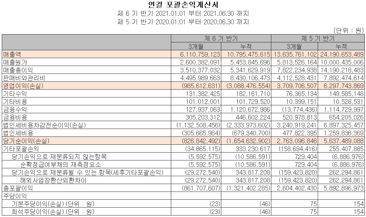 2021년 상반기 말 현재 자산총계는 전기 말보다 30.1% 늘어난 832억 원으로 단기금융자산의 증가에 기인합니다. 부채총계는 94.8% 늘어난 405억 원으로 장기 차입금의 증가가 있었습니다. 자본총계는 1.1% 감소한 428억 원을 기록했습니다.