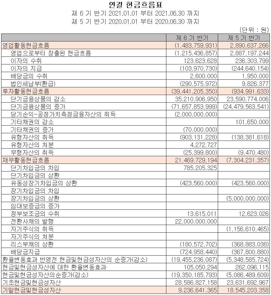 지난 상반기 영업활동 현금흐름에서는 15억 원의 현금이 유출되었으며, 투자활동에서는 단기금융상품의 증가 및 유형자산의 취득 등으로 394억 원의 현금이 유출되었습니다. 재무활동에서는 차입금을 차입하고, 220억 원 규모의 전환사채 발행을 통해 자금을 조달하면서, 배당금을 지급하고 당기 부채를 상환함에도 215억 원의 현금이 유입되었습니다. 당사는 전환사채로 조달한 자금으로 제조시설 확충, 반도체 테스트 장비 연구개발 및 원자재 구매 등에 사용할 계획이라고 밝혔습니다. 2021년 상반기 말 기준 현금성 자산은 92억 원을 보유하고 있습니다.