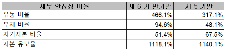 2021년 상반기 말 기준 재무안정성 비율에서는 유동비율 466.1%, 부채비율 94.6%, 자기자본비율 51.4%, 자본유보율 1118.1%를 기록했습니다. 전기 대비 부채비율이 비교적 큰 폭으로 증가했으나, 5세대 SSD 테스터 장비 개발 및 양산 장비 공급 예정, 메모리 번인 테스터 고객사 확대, 자동차용 LED 테스터 상용화 등으로 인한 생산능력 확대 및 신규 장비 생산라인 확보를 위한 투자에 따른 것으로 2022년 투자에 따른 실적 회복을 예상하고 있습니다.
