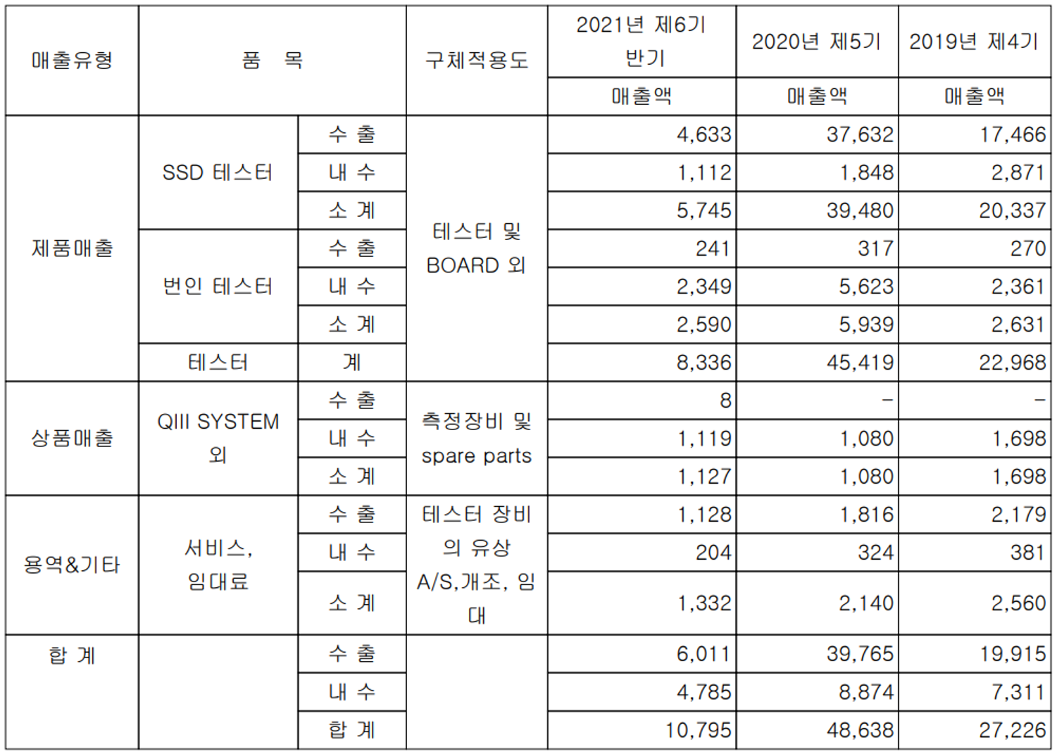 당사는 반도체 후공정 중 SSD(Solid State Drive)와 메모리 번인 테스터(MBT, Monitoring Burn-in Tester) 등 검사 장비를 전문으로 제조하고 있습니다. 기타 파트너십을 통한 Surface Particle Detector인 QIII system 등의 상품 매출과 용역 서비스 등이 있습니다. 지난 상반기 SSD 테스터의 매출은 57억 원으로 전체 매출의 53.2%를 차지하였으며, 메모리 번인 테스터의 매출은 26억 원으로 24%를 기록했습니다.
