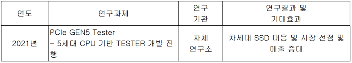 당사는 당기 중 인텔 CPU 기반의 차세대 SSD 테스터인 PCIe GEN5 Tester의 개발을 진행하였습니다. 2022년 초 매출이 가시화 될것으로 전망하고 있으며, 당해 하반기부터 양산장비의 공급이 시작될 것으로 기대하고 있습니다.
