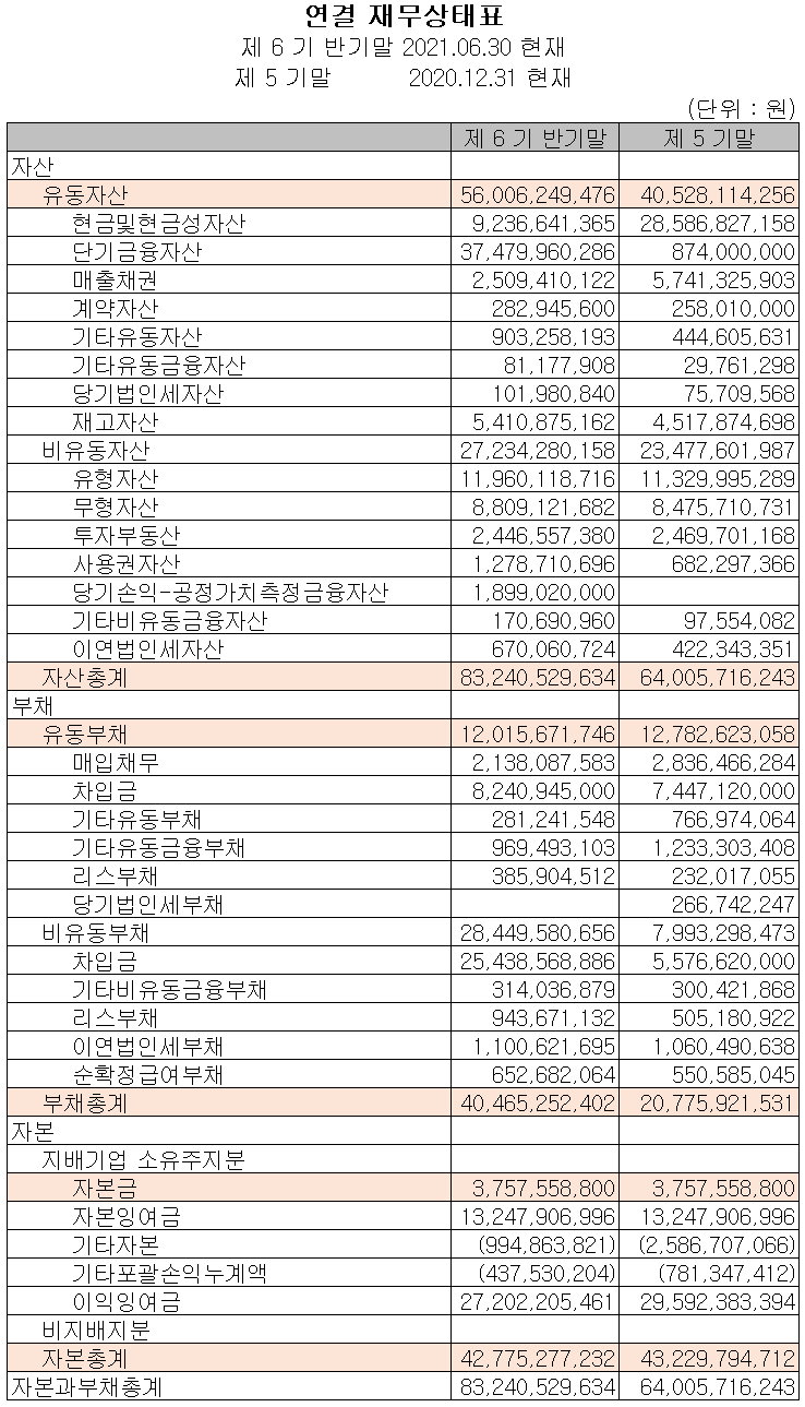 2021년 상반기 말 현재 자산총계는 전기 말보다 30.1% 늘어난 832억 원으로 단기금융자산의 증가에 기인합니다. 부채총계는 94.8% 늘어난 405억 원으로 장기 차입금의 증가가 있었습니다. 자본총계는 1.1% 감소한 428억 원을 기록했습니다.