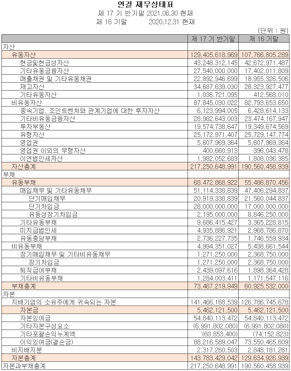 지난 상반기 말 현재 자산총계는 전기 말보다 14%(267억) 늘어난 2,173억 원으로 금융자산, 매출채권 및 재고자산 등의 증가에 기인합니다. 부채총계는 20.6%(125억) 늘어난 735억 원으로 매입채무, 단기차입금 등의 증가가 있었습니다. 자본총계는 당기순이익에 따른 잉여금의 증가로 141억 원이 증가한 1,438억 원을 기록했습니다.