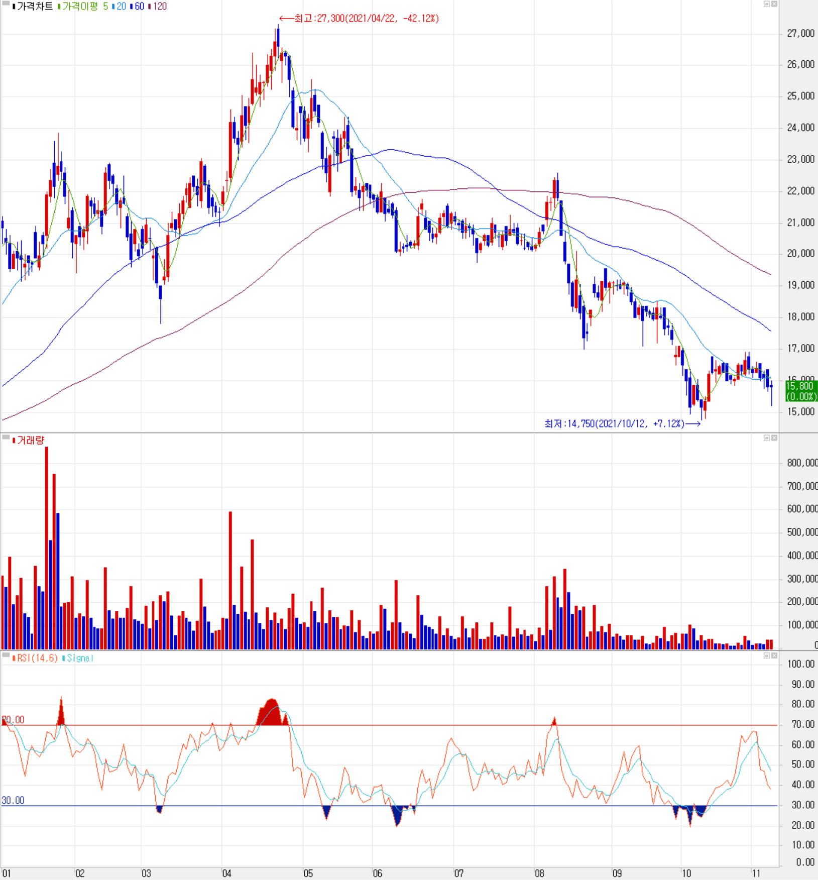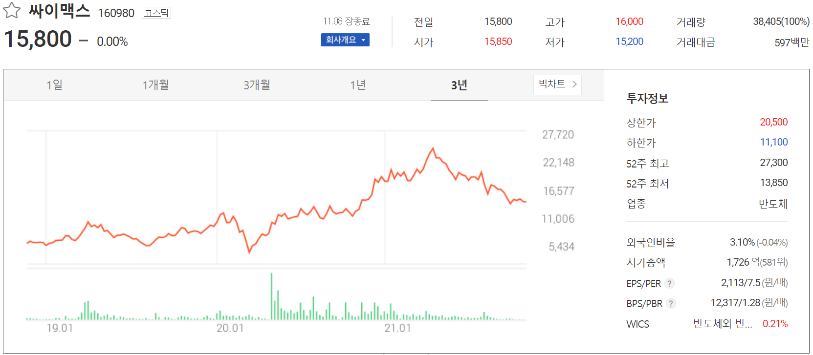 11월 8일 장 종료 기준 당사의 주가는 전 거래일 종가와 같은 가격인 15,800원에 거래를 마감했습니다. 외국인 비중은 3.10%이며 시가 총액 1,726억 원으로 코스닥 시총 기준 581위 종목입니다.