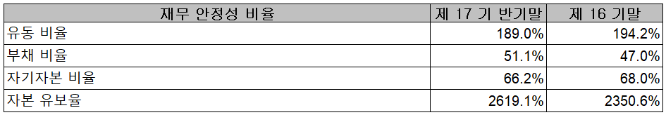 2021년 상반기 말 기준 재무안정성 비율에서는 유동비율 189%, 부채비율 51.1%, 자기자본비율 66.2%, 자본유보율 2,619.1%를 기록하면서 양호한 재무상태를 유지하고 있습니다.