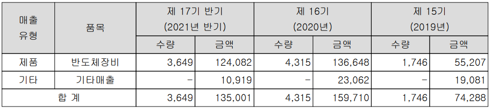 환경설비 사업부문에는 Bab Filter, Marble Scrubber 등 집진설비와 Packed Tower, Activated Carbon Tower, FRP Scrubber 등 정화 장치를 공급하고 있습니다. 지난 상반기 실적에서 반도체 장비 사업부문의 매출은 1,350억 원으로 전체 매출의 95.3%를 차지하였습니다.