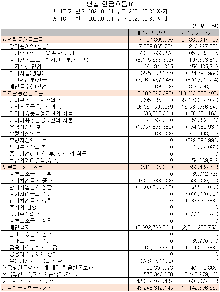 지난 상반기 영업활동 현금흐름에서는 177억 원의 현금이 유입되었으며, 투자활동에서는 기타유동금융자산의 증가 및 유형 자산의 취득으로 167억 원의 현금이 유출되었습니다. 재무활동에서는 차입금을 차입하고, 당시 부채를 상환하였으며, 배당금을 지급하면서 5억 원의 현금이 유출되었습니다. 2021년 상반기 말 기준 현금성 자산은 전년 동기 말보다 261억 원이 늘어난 432억 원을 보유하고 있습니다.