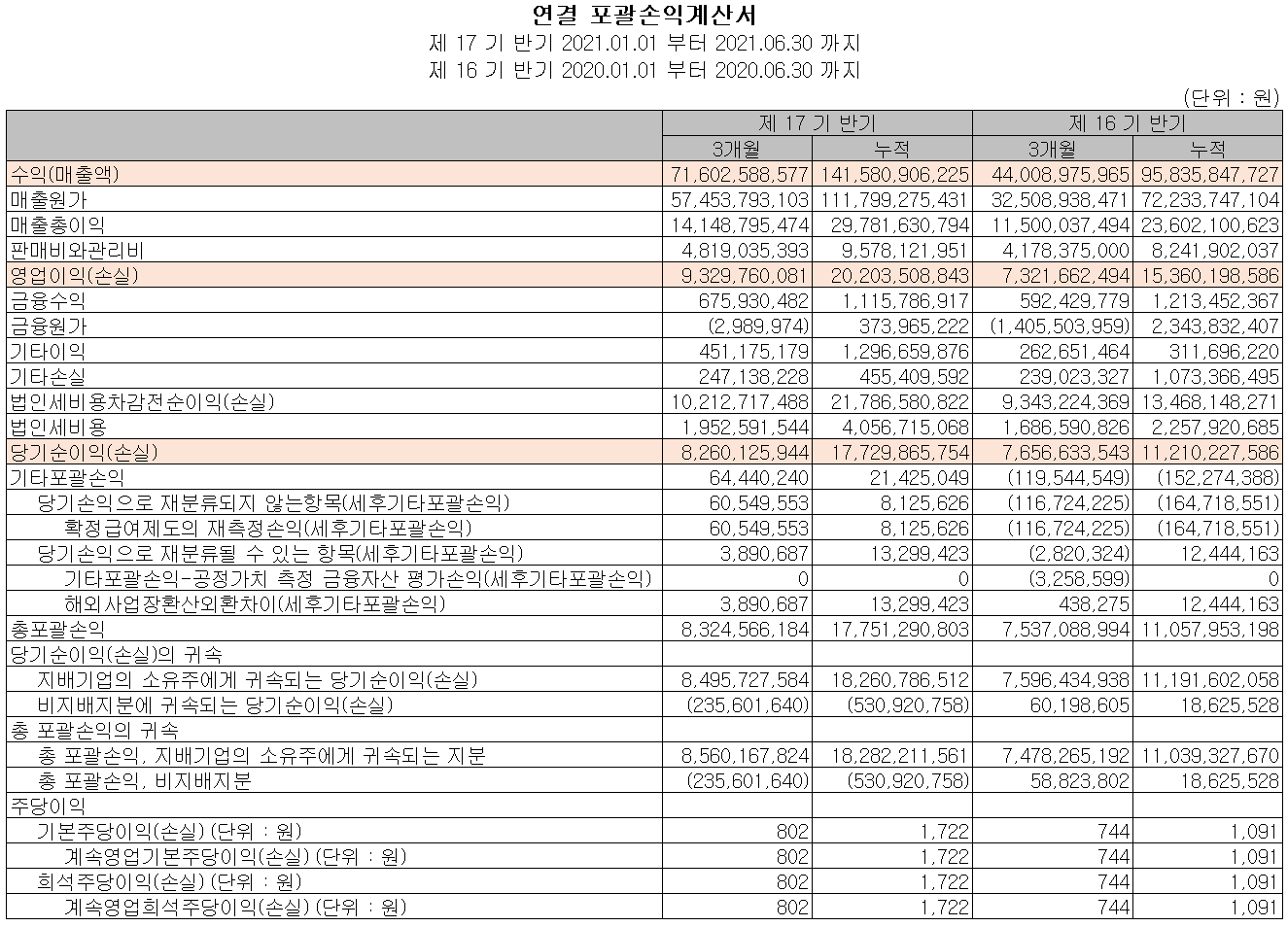 지난 상반기 말 현재 자산총계는 전기 말보다 14%(267억) 늘어난 2,173억 원으로 금융자산, 매출채권 및 재고자산 등의 증가에 기인합니다. 부채총계는 20.6%(125억) 늘어난 735억 원으로 매입채무, 단기차입금 등의 증가가 있었습니다. 자본총계는 당기순이익에 따른 잉여금의 증가로 141억 원이 증가한 1,438억 원을 기록했습니다.