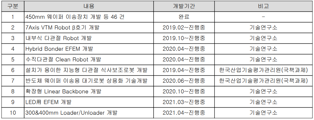 당기 중에는 LED용 EFEM 및 300mm와 400mm 웨이퍼용 Loader/Unloader 등을 개발 중에 있습니다.
