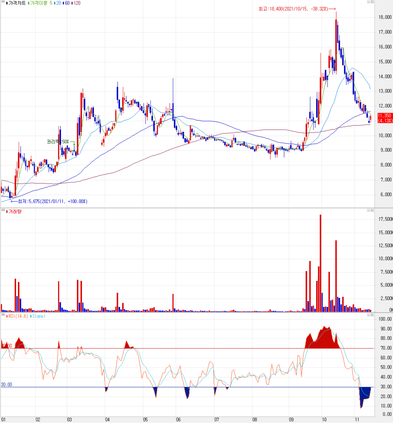 11월 12일 장 종료 기준 당사의 주가는 전 거래일보다 4.13% 오른 11,350원에 거래를 종료했습니다. 외국인 비중은 2.59%이며, 시가 총액 2,104억 원으로 코스닥 시총 기준 460위 종목입니다.