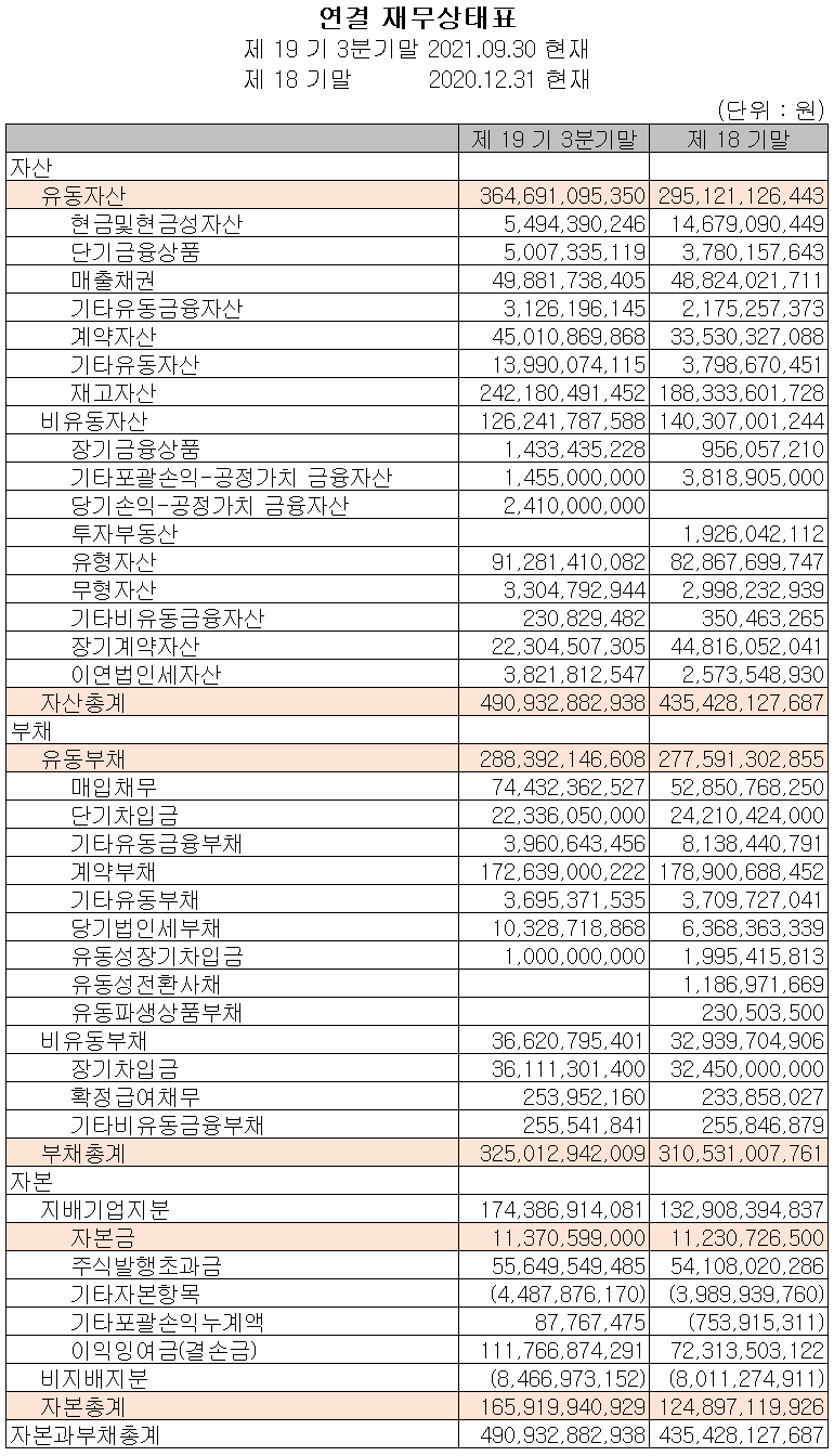 2021년 3분기 말 현재 자산총계는 전기 말보다 12.7% 늘어난 4,909억 원으로 계약자산, 기타유동자산, 재고자산 및 유형자산의 증가에 기인합니다. 부채총계는 4.7% 늘어난 3,250억 원으로 매입채무 및 장기차입금의 증가가 있었습니다. 자본총계는 410억 원이 늘어난 1,659억 원으로 이익잉여금의 증가에 따릅니다.