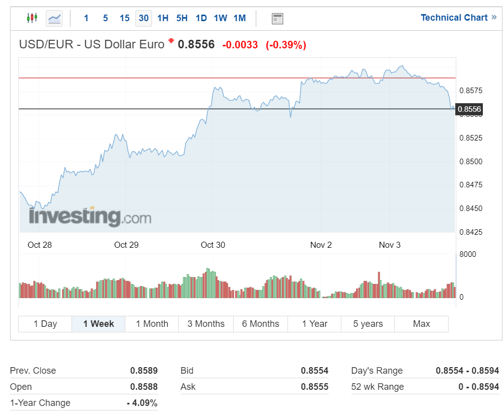 유로 환율은 유로화의 약세가 지속되는 모습이나 오늘은 하락하면서 0.8556을 기록 중입니다.
