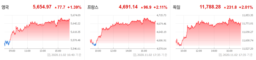 간밤의 유럽 증시는 강한 반등세를 보였습니다. 코로나19로 인한 봉쇄조치는 이미 시행되었고 예상된 우려였지만, 유럽 주요국들 역시 미국 대선의 불확실성이 어느 정도 걷힌 모습이었습니다.