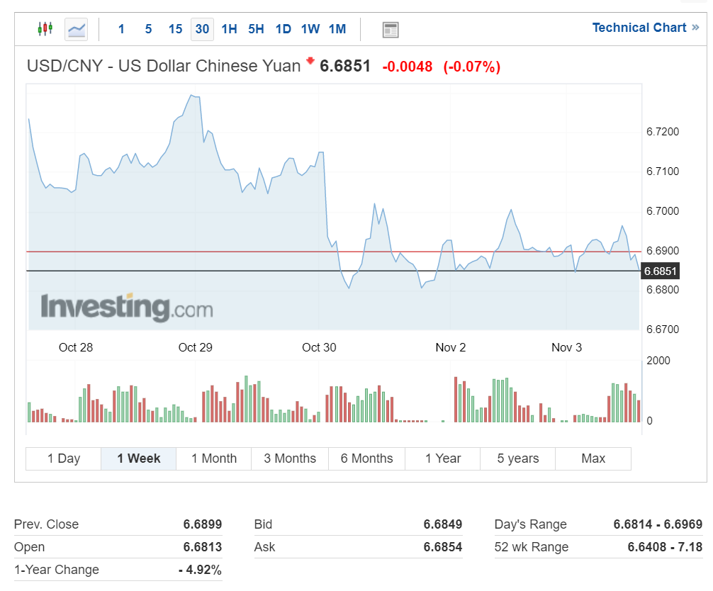 위안화 환율은 소폭 내린 1달러당 6.6851위안을 기록 중입니다.