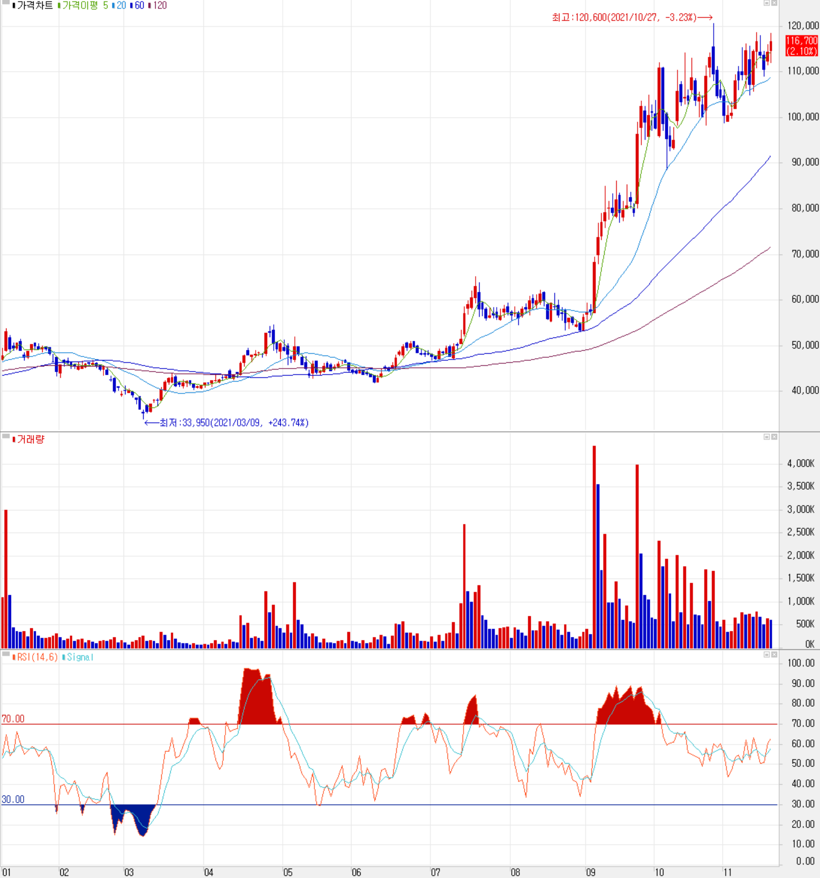 11월 18일 장 종료 기준 당사의 주가는 전일보다 2.1% 오른 116,700원에 거래를 마감했습니다. 외국인 비중은 14.39%이며, 시가 총액 1조 8,066억 원으로 코스닥 시총 기준 29위 종목입니다.