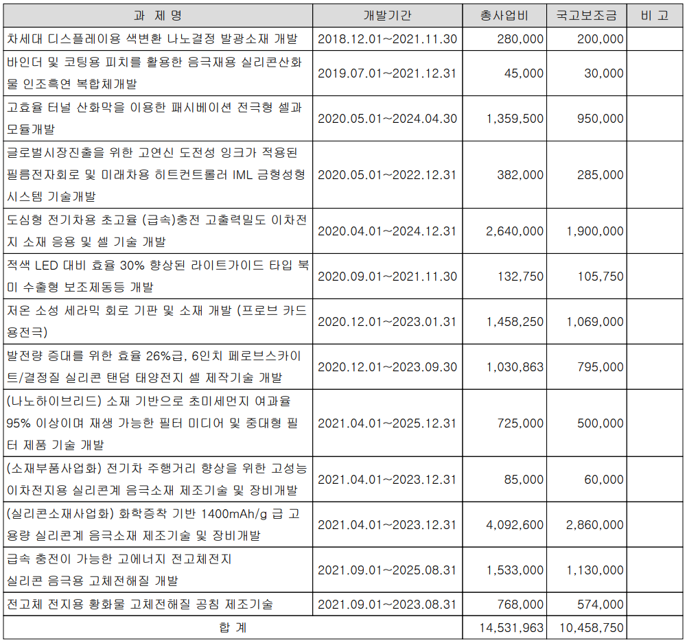 당사는 지난 3분기 매출액의 3.71%인 57억 원 규모의 비용을 연구개발에 투입하면서 소재부품 사업화, 실리콘 소재 사업화 등 다양한 국책과제 및 태양광 도전성 접착제의 개발 등 자체 연구개발을 수행하고 있습니다.