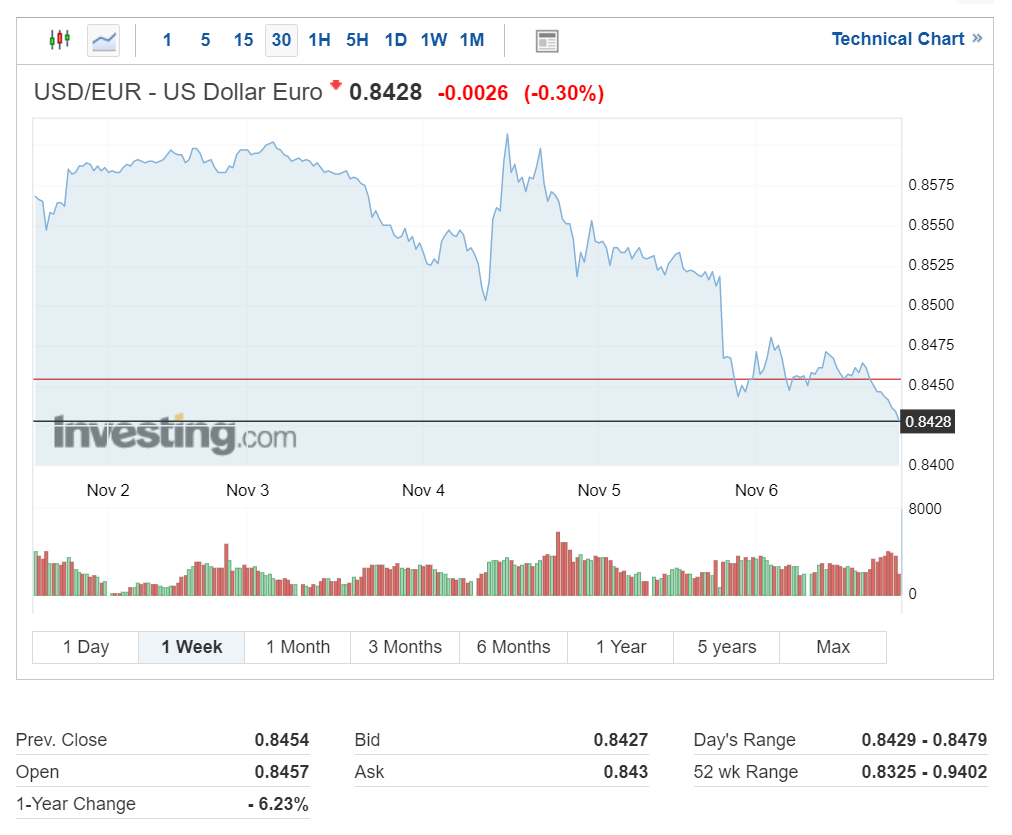 유로 환율은 현재 1달러당 0.8428을 기록하는 중입니다.
