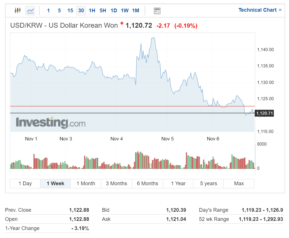 원달러 환율은 1120원 아래를 위협하면서 현재 1120.72를 기록 중입니다.