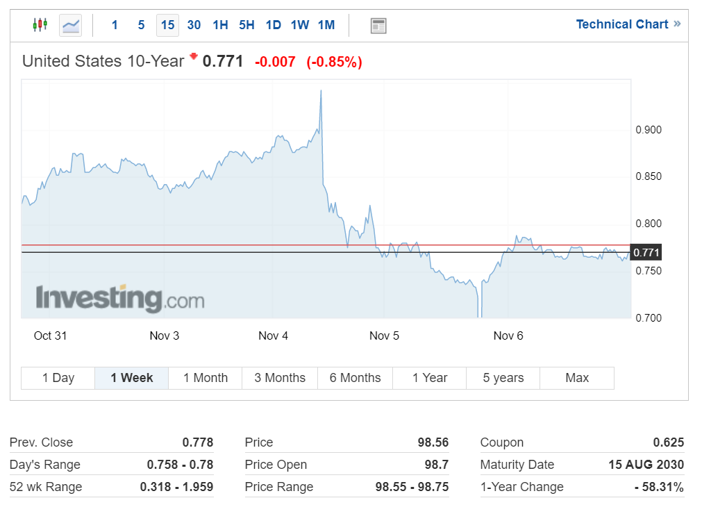 미국 국채 10년 물 금리는 오늘 연준의 파월 의장이 금리를 0.00~0.25%로 유지한다고 발표하고 혼조세를 보이는 모습입니다.