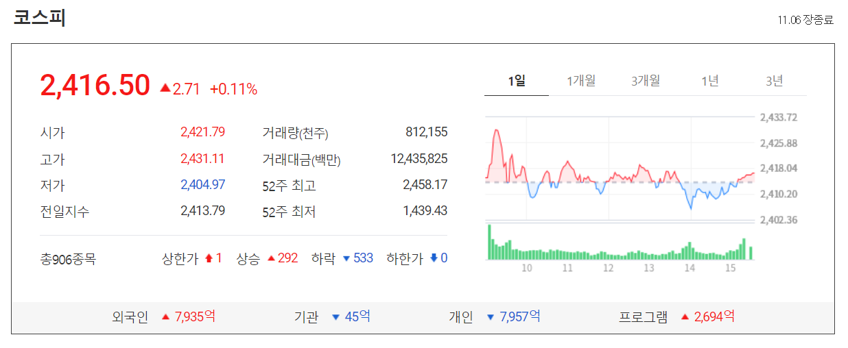 오늘 코스피 시장은 외국인의 꾸준한 순매수 속에 오늘 오전 도날드 트럼프 미국 대통령 후보의 선거부정 발언으로 인한 개인의 매도세가 커지면서 공방이 이어졌으나 2400선을 잘 지키면서 보합으로 마감했습니다. 수급면에서는 외국인이 7935억 원어치 순매수했고, 기관과 개인은 각각 45억, 7957억 원어치 순매도했습니다.