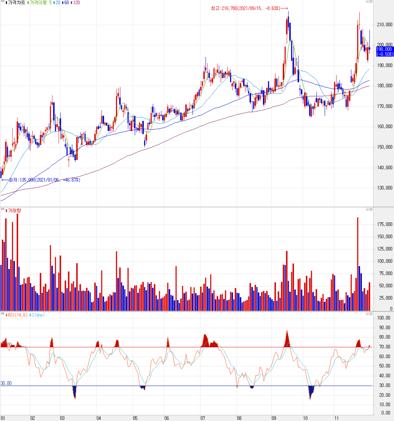 지난 9월 시장 전반의 조정을 받으면서 17만 원 부근까지 하락했던 주가는 11월 들어서면서 반도체 검사용 소켓의 제품 믹스의 개선에 따른 실적이 호전된다는 소식이 전해지면서 급등하였으나, 전고점인 216,000원을 넘지 못하고 최근 20만 원 부근에서 주가가 형성되고 있습니다. 최근 기관의 매수세가 유입되면서 주가 상승을 이끌었으며, 개인은 매도 우위를 보이고 있습니다. 예상 실적 및 차트 소견을 종합한 개인적인 목표주가는 230,000원으로 설정하였습니다.