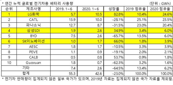 상기 표에서 보다시피 LG화학의 배터리 사용량은 2019년 대비 무려 82.8%의 성장률을 보이며 글로벌 시장 점유율 1위에 등극했습니다.