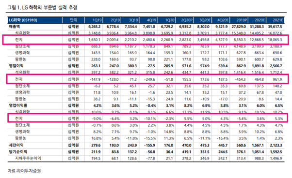 위 표에서 보면 석유화학의 안정적인 실적 가운데 전지사업 분야가 2사 분기에 크게 개선되었습니다.