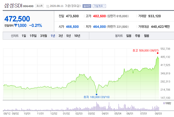 2020년 8월 11일(화) 기준 삼성SDI 주가입니다.