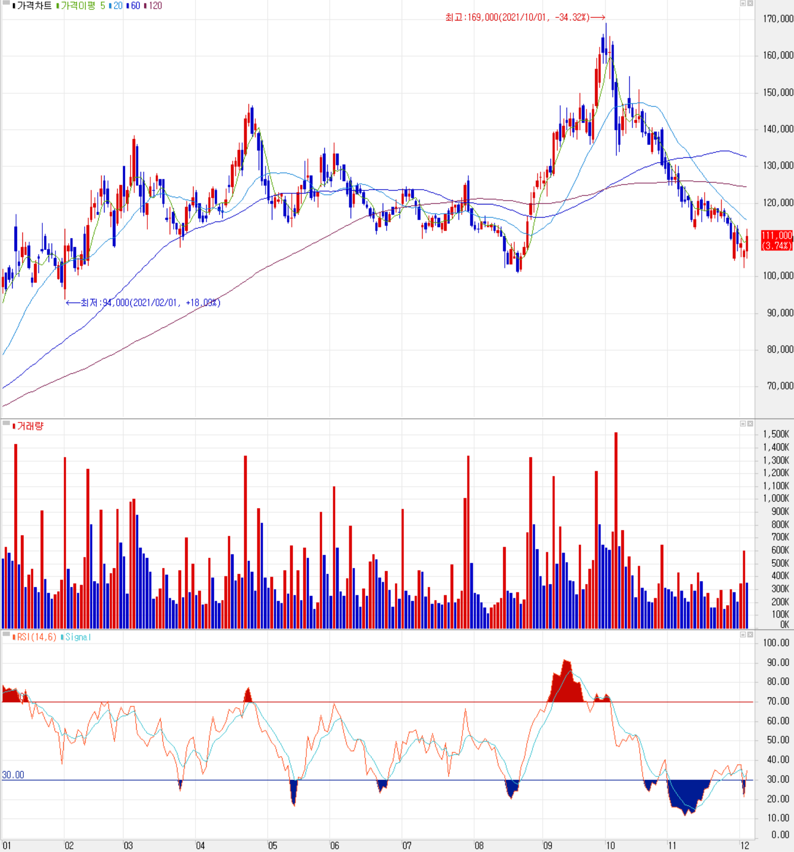 12월 3일 장 종료 기준 당사의 주가는 전일보다 3.74% 오른 111,000원에 거래를 마쳤습니다. 외국인 비중은 19.95%이며, 시가총액 2조 6,473억 원으로 코스피 시총 기준 120위 종목입니다.