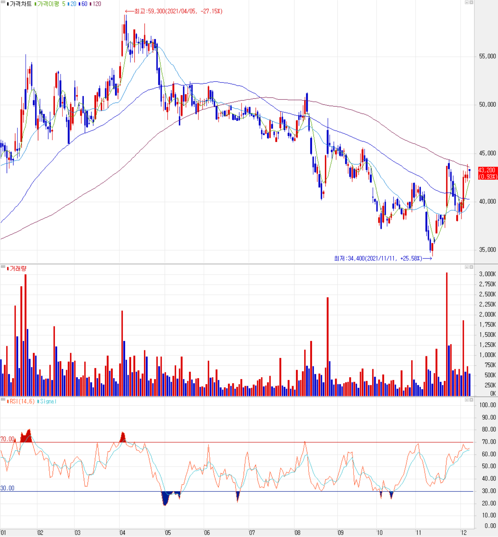 12월 7일 장 종료 기준 당사의 주가는 전일보다 0.93% 오른 43,200원에 거래를 마쳤습니다. 외국인 비중은 19.03%이며, 시가총액 2조 1,204억 원으로 코스닥 시총 기준 20위 종목입니다.