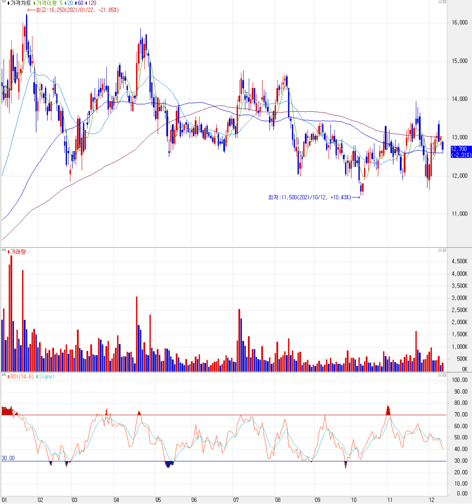 당사의 주가는 지난 10월 글로벌 공급망 이슈와 미국 인플레이션 이슈 등 시장 외적인 변동성에 따라 연중 최저치인 11,500원을 기록한 후 12,000~14,000원 사이에서 움직이고 있습니다. 최근 한 달간 수급에서는 개인의 매수세에 기관은 매도 위주로 대응하고 있으며, 외국인은 최근 6 거래일 연속 순매수하다가 12월 10일 소폭의 매도세를 나타냈습니다. 예상실적 및 차트 소견을 종합한 개인적인 목표주가는 17,000원으로 설정하였습니다.