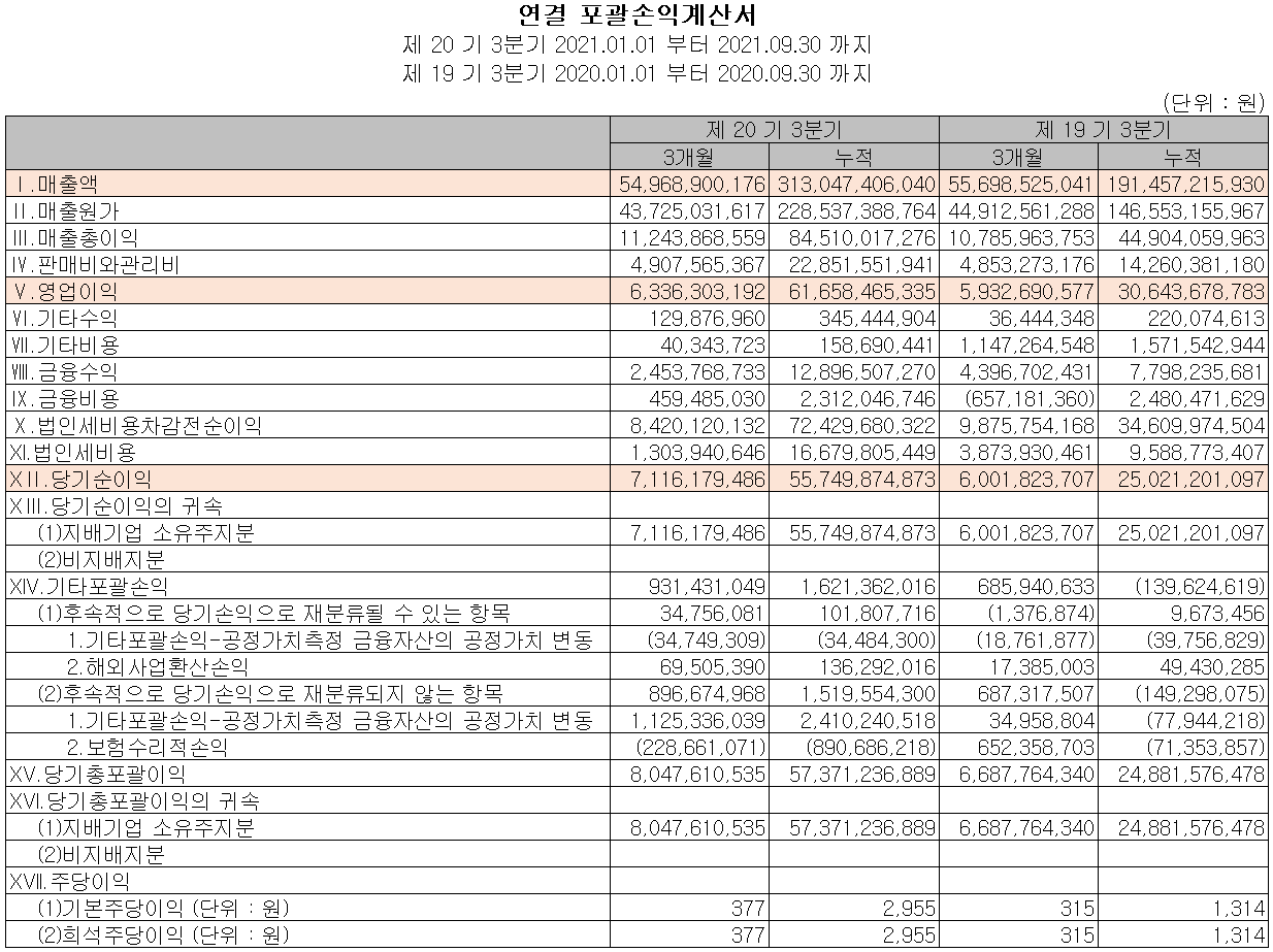 지난 3분기 실적은 매출액 550억 원으로 전년 동기 대비 1.3% 감소했고, 영업이익은 63억 원으로 6.8% 증가, 분기순이익은 71억 원으로 18.6% 증가했습니다.
