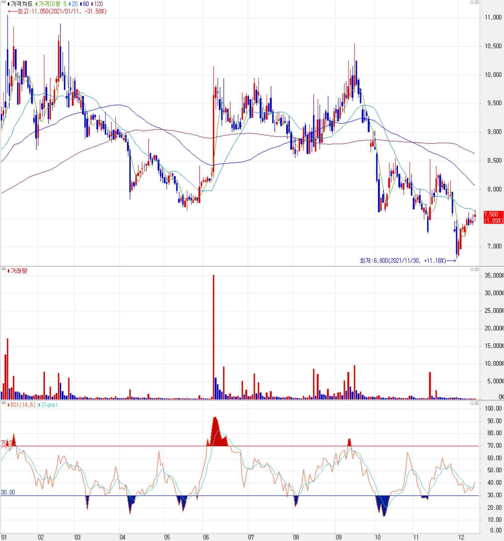 12월 13일 장 종료 기준 당사의 주가는 전 거래일보다 1.89% 오른 7,560원에 거래를 마감했습니다. 외국인 비율은 2.74%이며, 시가총액 2,602억 원으로 코스닥 시총 기준 377위 종목입니다.