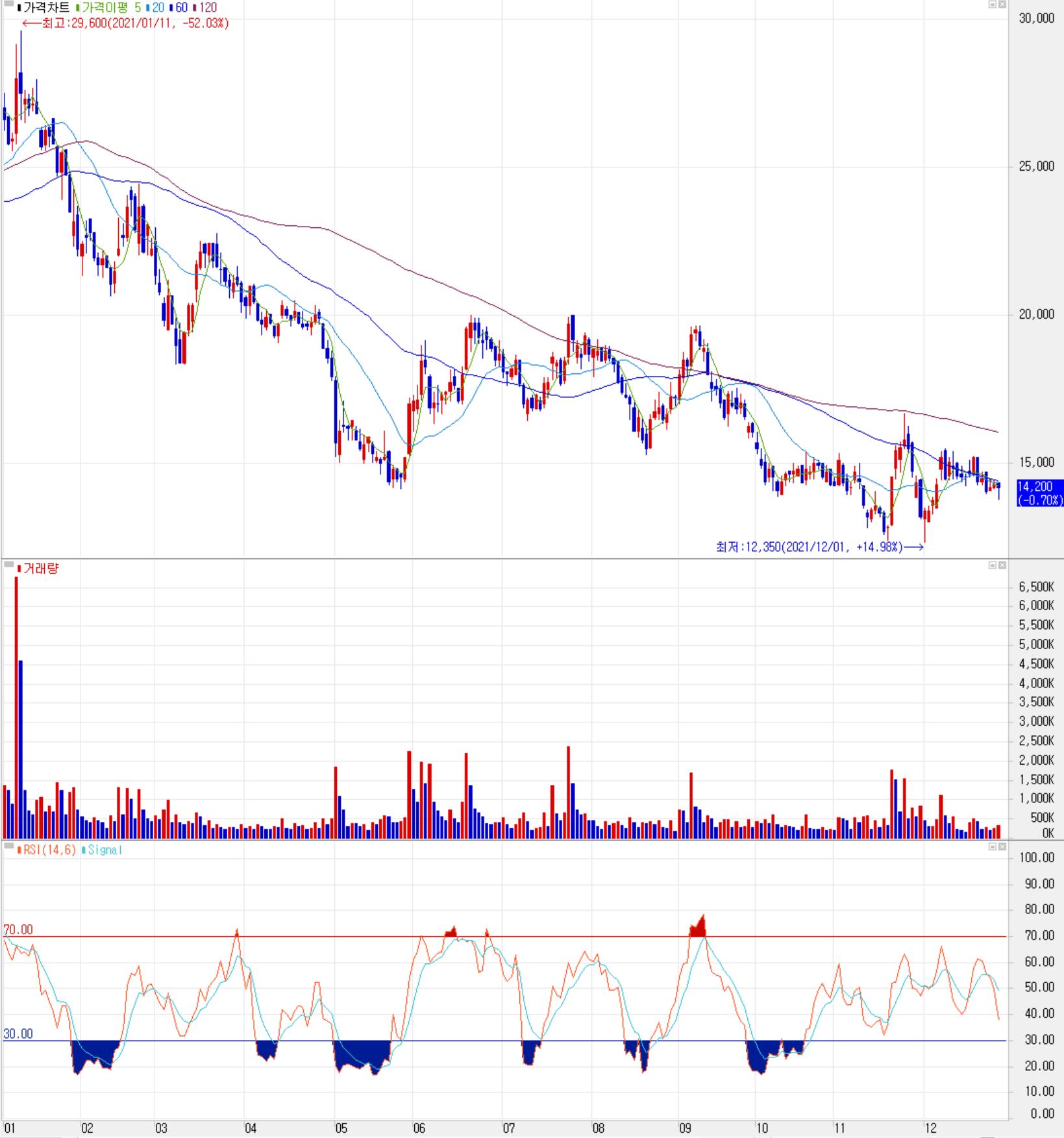 12월 27일 장 종료 기준 당사의 주가는 전 거래일보다 0.7% 내린 14,200원에 거래를 마쳤습니다. 외국인 비중은 4.58%이며, 시가총액 6,209억 원으로 코스닥 시총 기준 131위 종목입니다.