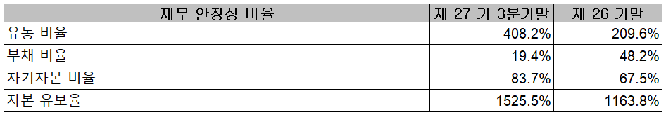 2021년 3분기 재무 안정성 비율에서는 유동비율 408.2%, 부채비율 19.4%, 자기자본비율 83.7%, 자본 유보율 1,525.5%를 기록하면서 건실하고 안정적인 재무상태를 유지하고 있습니다.