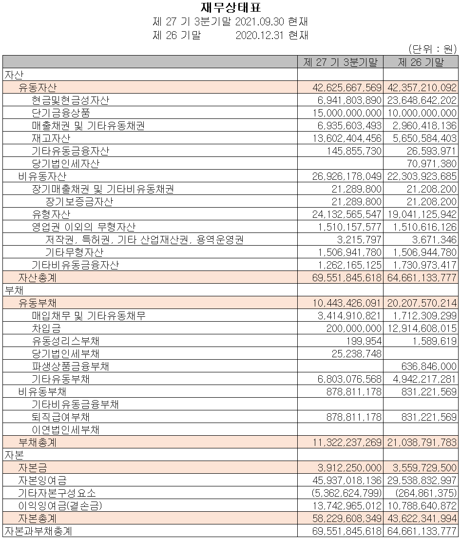 2021년 3분기 말 현재 자산총계는 전기말보다 7.6% 늘어난 696억 원으로 단기금융상품, 매출채권, 재고자산 및 유형자산의 증가에 기인합니다. 부채총계는 46.2% 줄어든 113억 원으로 유동성 차입금의 감소에 따릅니다. 자본총계는 자기 주식의 취득으로 28억 원이 줄었으나, 당기순이익 및 주식매수 선택권 행사 등으로 총 146억 원이 늘어나면서 582억 원을 기록했습니다.