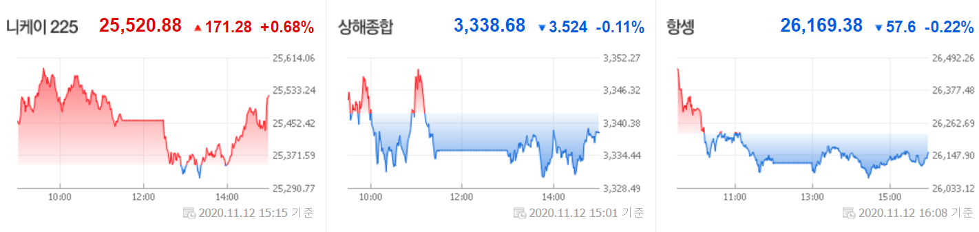 중국 증시는 소폭 하락한 반면 일본 닛케이지수는 오늘도 상승하면서 29년 만에 최고치를 기록했습니다. 일본은 미국 대선 불확실성 및 코로나19 백신에 대한 기대감으로 11월 들어 9 거래일 연속 꾸준히 상승 중입니다. 중국은 어제 광군제로 인해 알리바바 등의 큰 매출 신장세가 있었으나 중국 내 코로나19 확진자가 연일 발생하면서 재확산 우려감으로 인해 혼조세를 보였습니다.