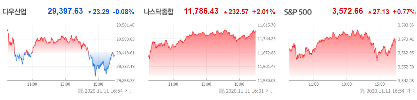 화이자와 바이오엔테크의 백신 개발 소식과 바이든 당선인의 빅테크 기업들에 대한 규제 강화 우려에 하락했던 줌(+9.93%), 마이크로소프트(+2.63%), 아마존(+3.37%), 페이스북(+1.49%), 구글(+0.55%), 넷플릭스(+2.19%) 등이 반등했습니다. 또한 테슬라는 1.65% 상승했으며, 수소차 관련 업체인 니콜라도 11.92% 오르면서 마감했습니다.