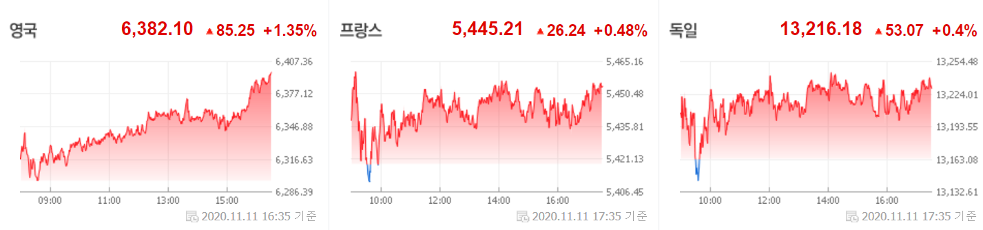 유럽 증시의 상승세가 계속되는 모습입니다. 11월 들어 영국, 프랑스 독일의 증시가 9 거래일 중 8일 상승하면서 미국 대선 불확실성 해소 및 점차 악화되는 코로나19 확산 중에 나온 백신 소식에 환호하는 것 같습니다. 다만, 오늘 시작한 증시는 일제히 하락세를 보이고 있습니다.