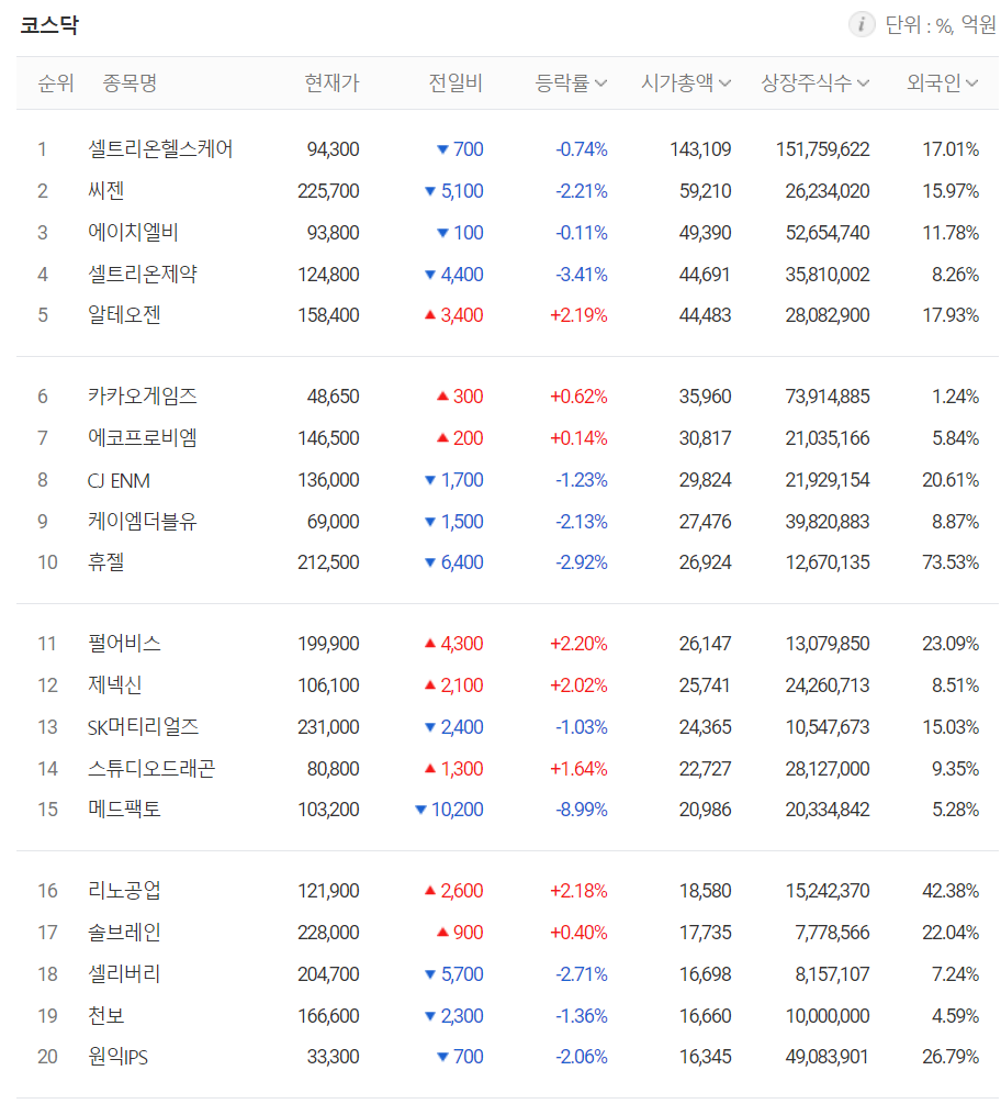 시가총액 상위 종목 중에서는 알테오젠, 카카오게임즈, 에코프로비엠, 펄어비스, 제넥신, 스튜디오드래곤, 리노공업, 솔브레인 등이 상승했고 셀트리온 헬스케어/제약, 씨젠, 에이치엘비 등은 하락했습니다.